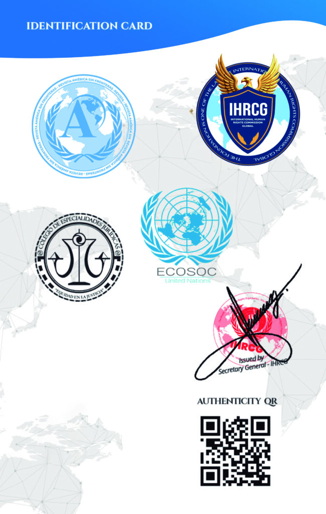 Cónsul de Paz a nivel global de la International Human Rights Commission Global y de la Revista América Sin Fronteras.