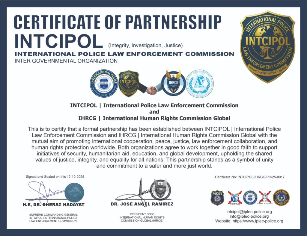 We are honored to share our Official Partnership Certificate, confirming our collaboration between INTCIPOL and IHRCG | International Human Rights Commission Global.